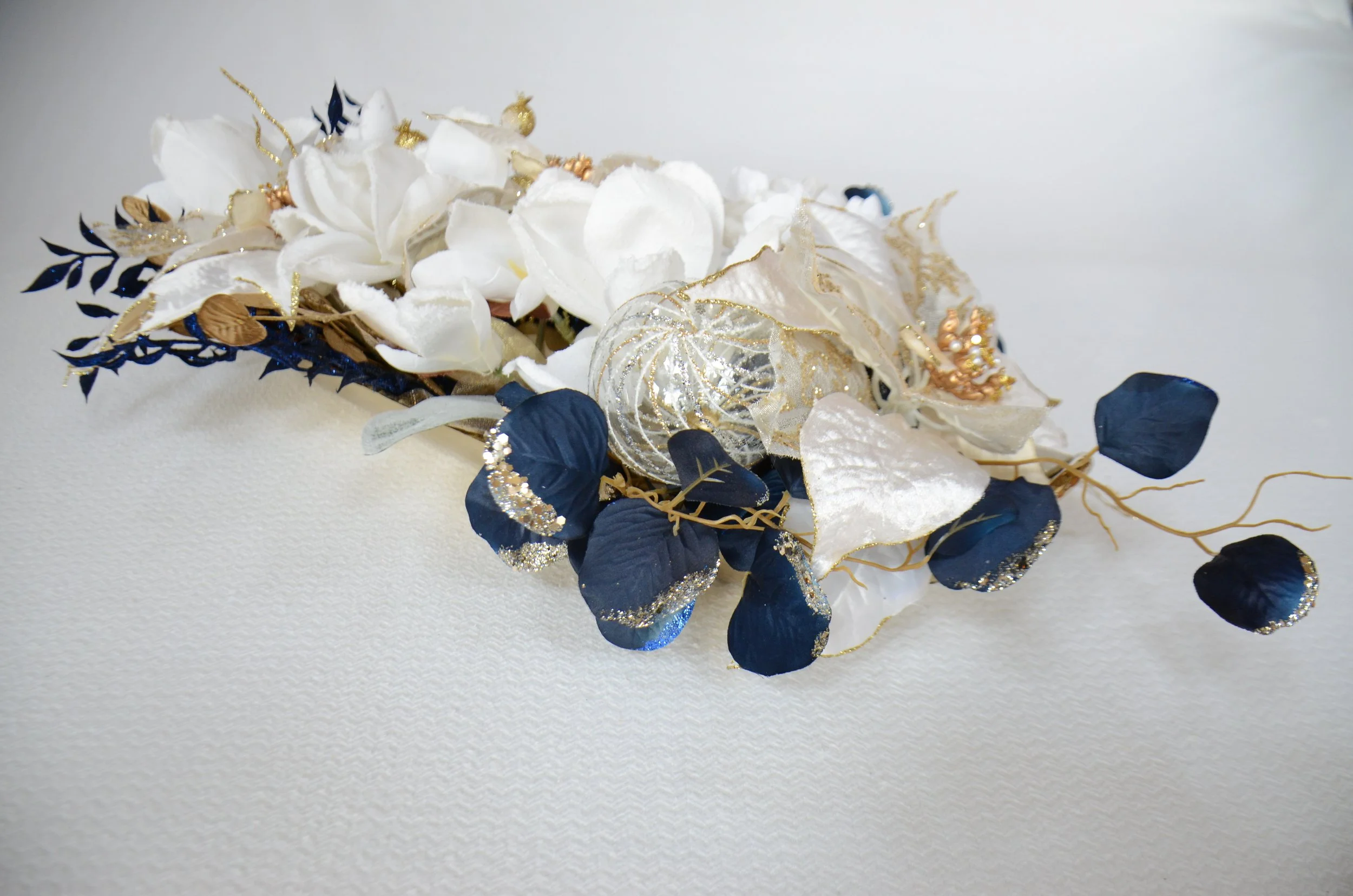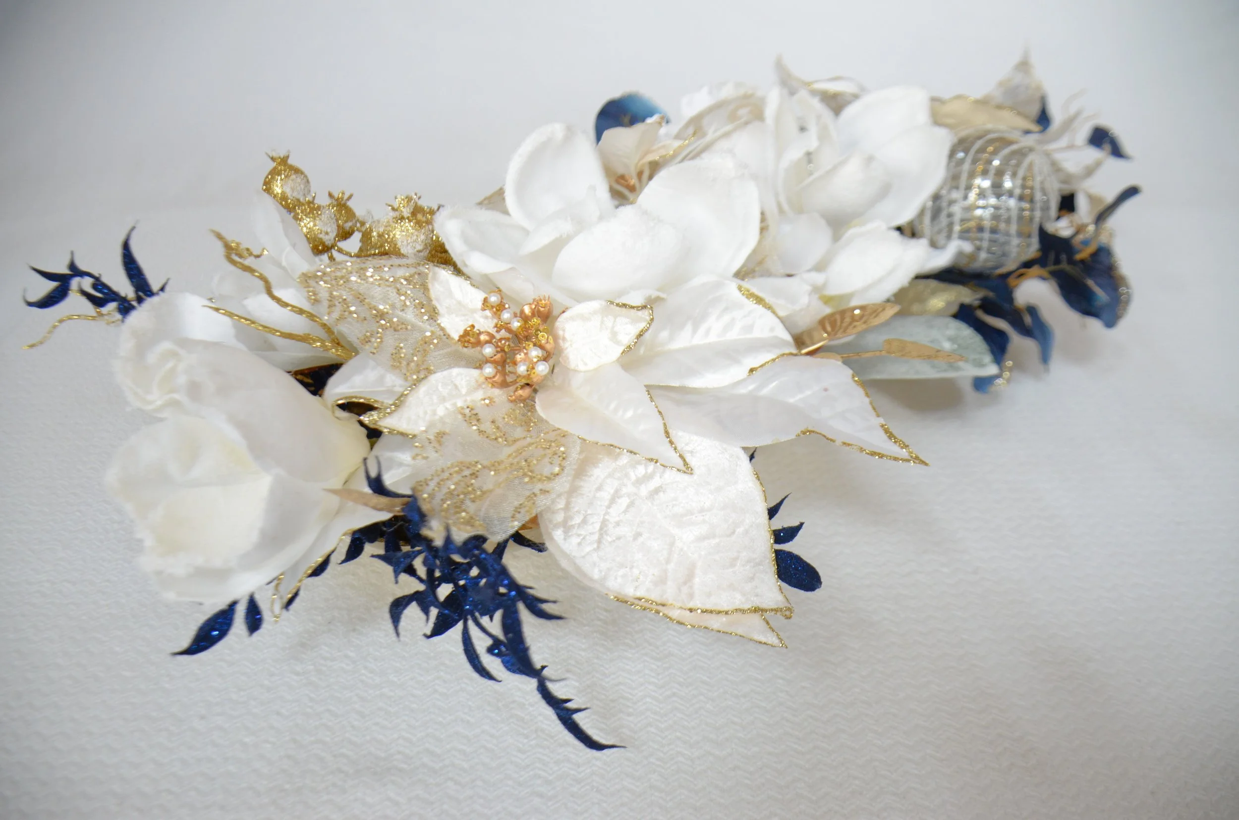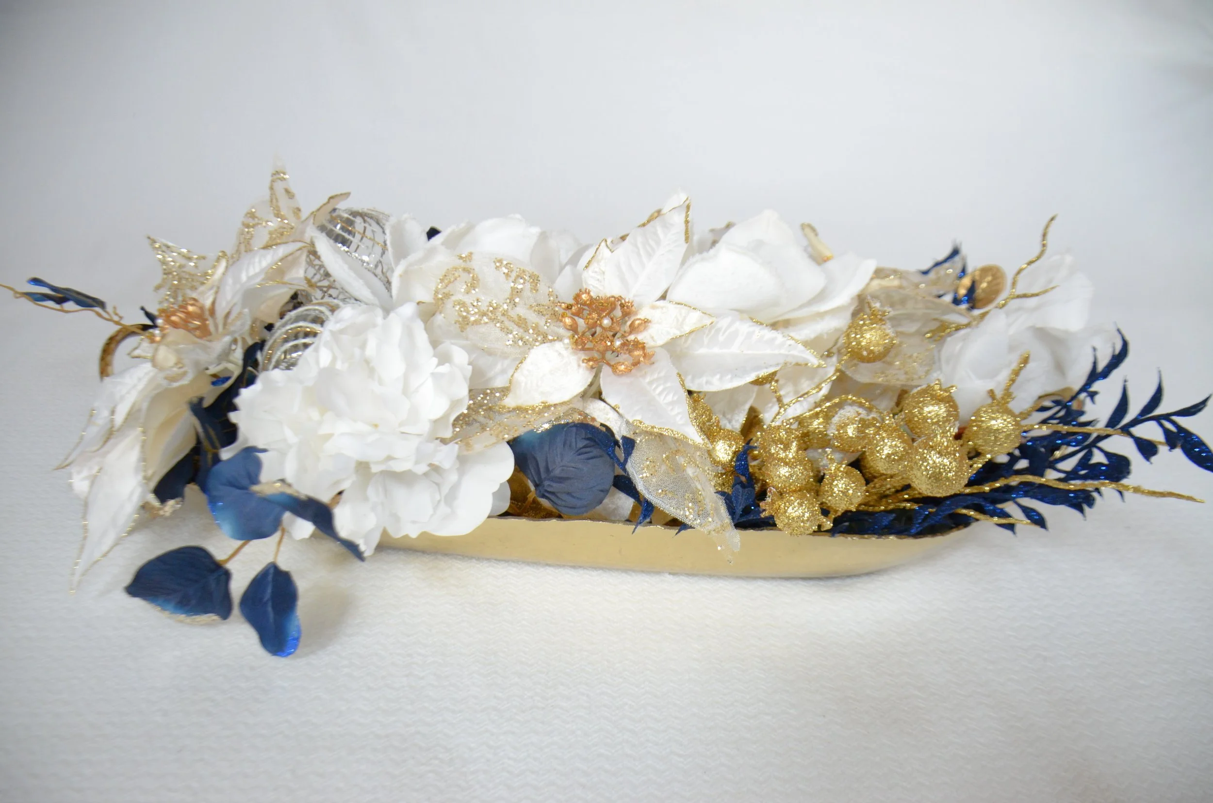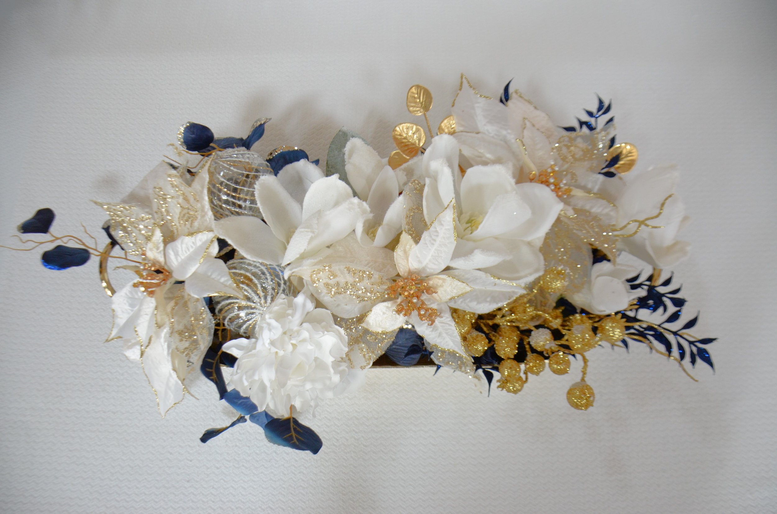 Magnolia in frost, white and gold Christmas flowers, white peony, goldenberries and navy blue leaves with golden rim arranged with two Christmas ornaments.