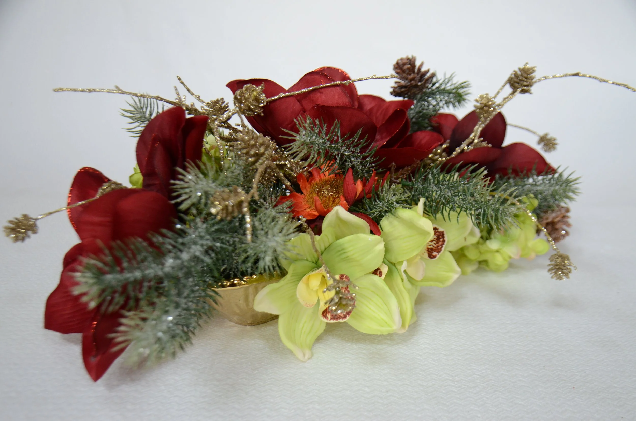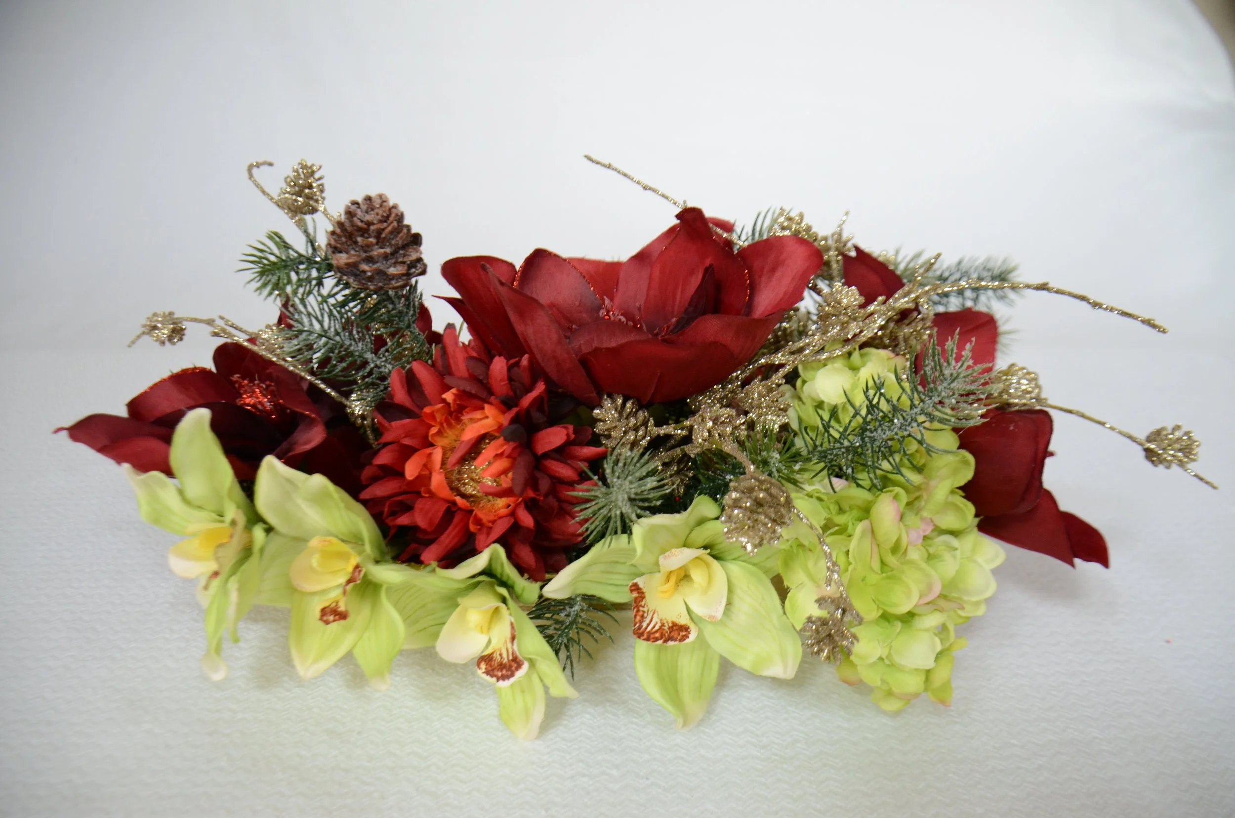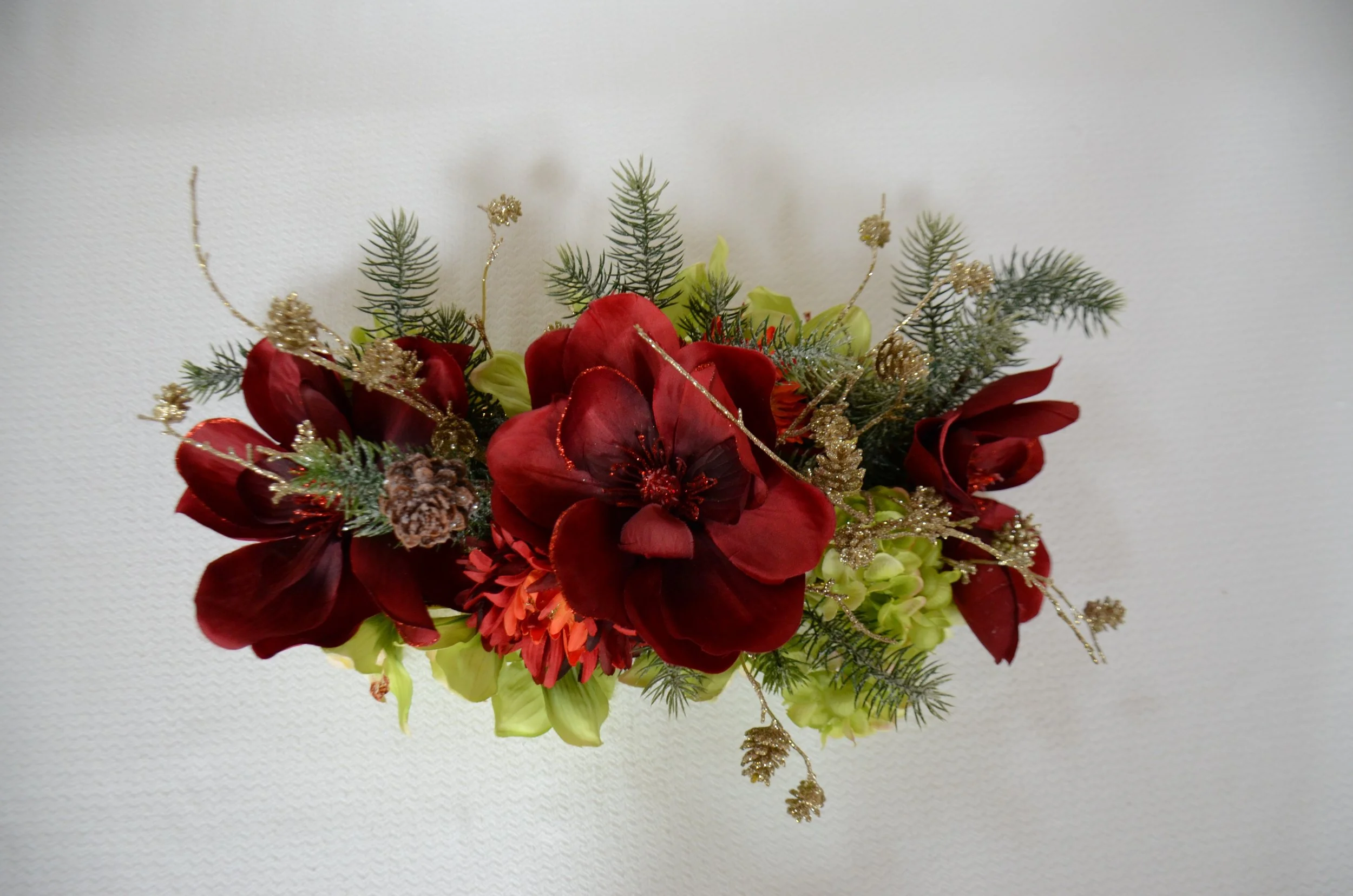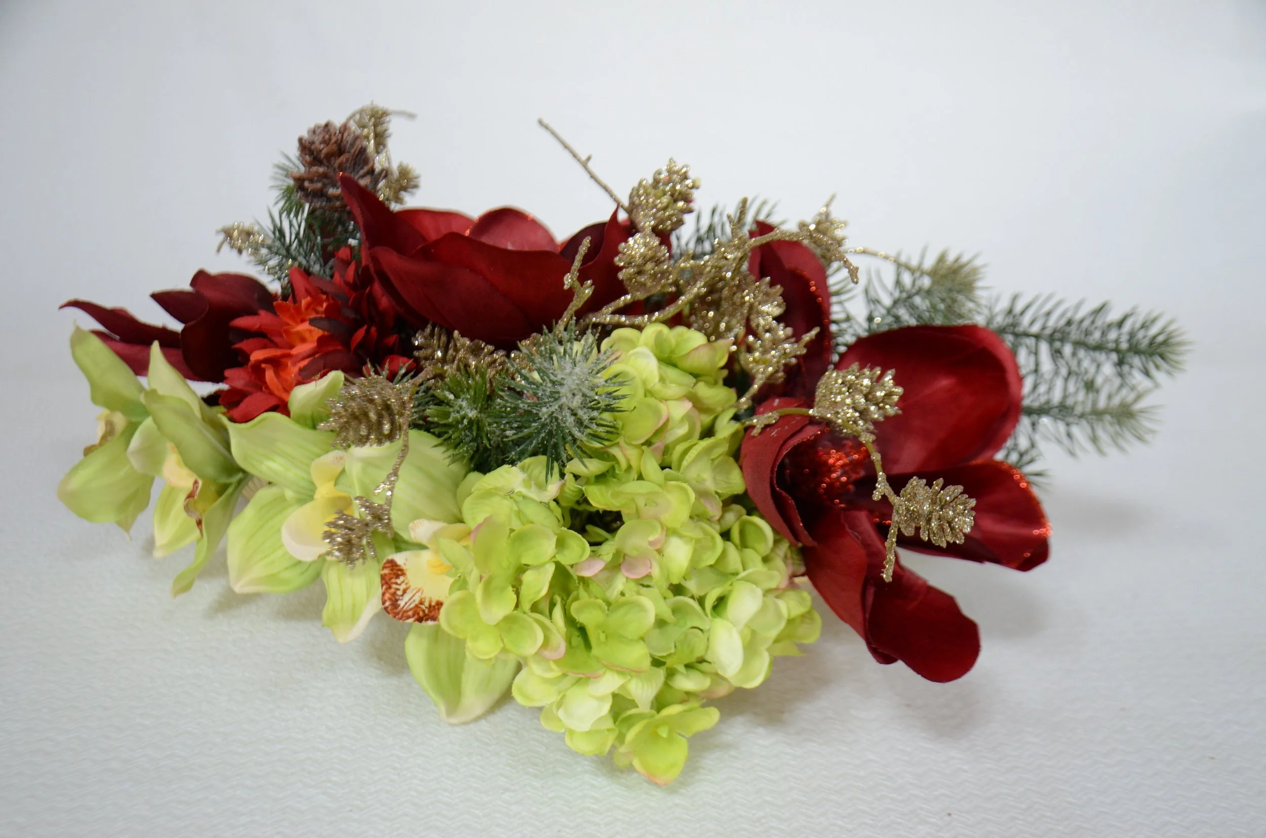 Green orchids, red, fully open magnolia, green hydrangea, with gold conifer cones, red winter berries and snowy pine branches.